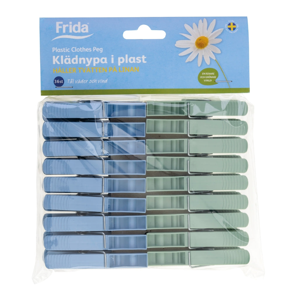 Klädnypa i vädertålig plast med blank förzinkad spiralfjäder.