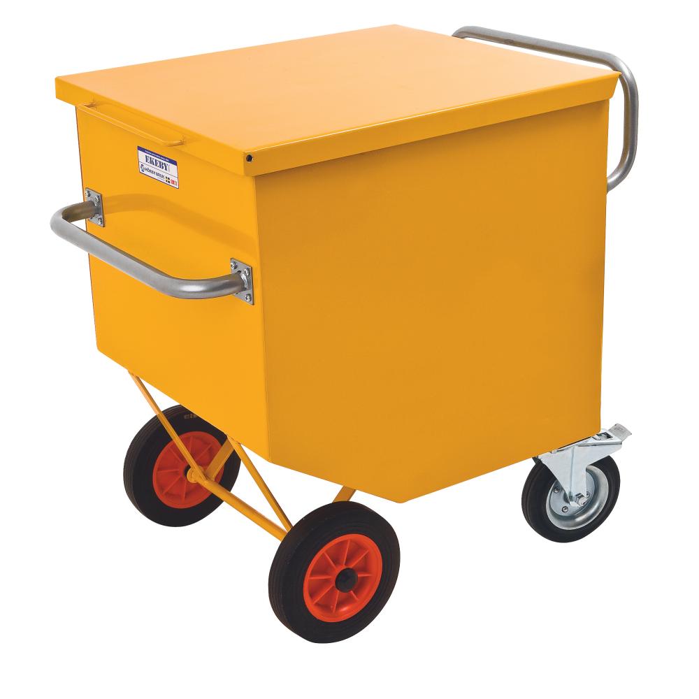 Praktisk verktygsvagn i 1,5 mm pulverlackerad stålplåt. Galvaniserade handtag på båda sidor. Handtaget baktill är utdragbart som stöd för locket, vilket då blir arbetsyta. Detta ger en ergonomiskt riktig arbetshöjd på 90 cm och ytan är försedd med gummiduk. Möjlighet att låsa locket med två hänglås på framsidan. Försedd med invändig verktygslåda i ugnslackerad plåt som kan skjutas i sidled och även lyftas ur vagnen. Vagnen kan erhållas med luftgummi- eller massivgummihjul framtill. Båda varianterna har massiva vridbara länkhjul med broms baktill. Max belastning: 300 kg. Mått hopfälld inkl. handtag: H900xB645xL925 mm. Mått invändigt låda: H655xB595xL700 mm. Mått arbetslock utfällt: H900xB645xL1490 mm. Volym invändigt: 250 liter. Vikt inkl. verktygslåda: 56 kg. Mått verktygslåda: H150xB250xL590 mm. Leveransutförande: Monterad.
