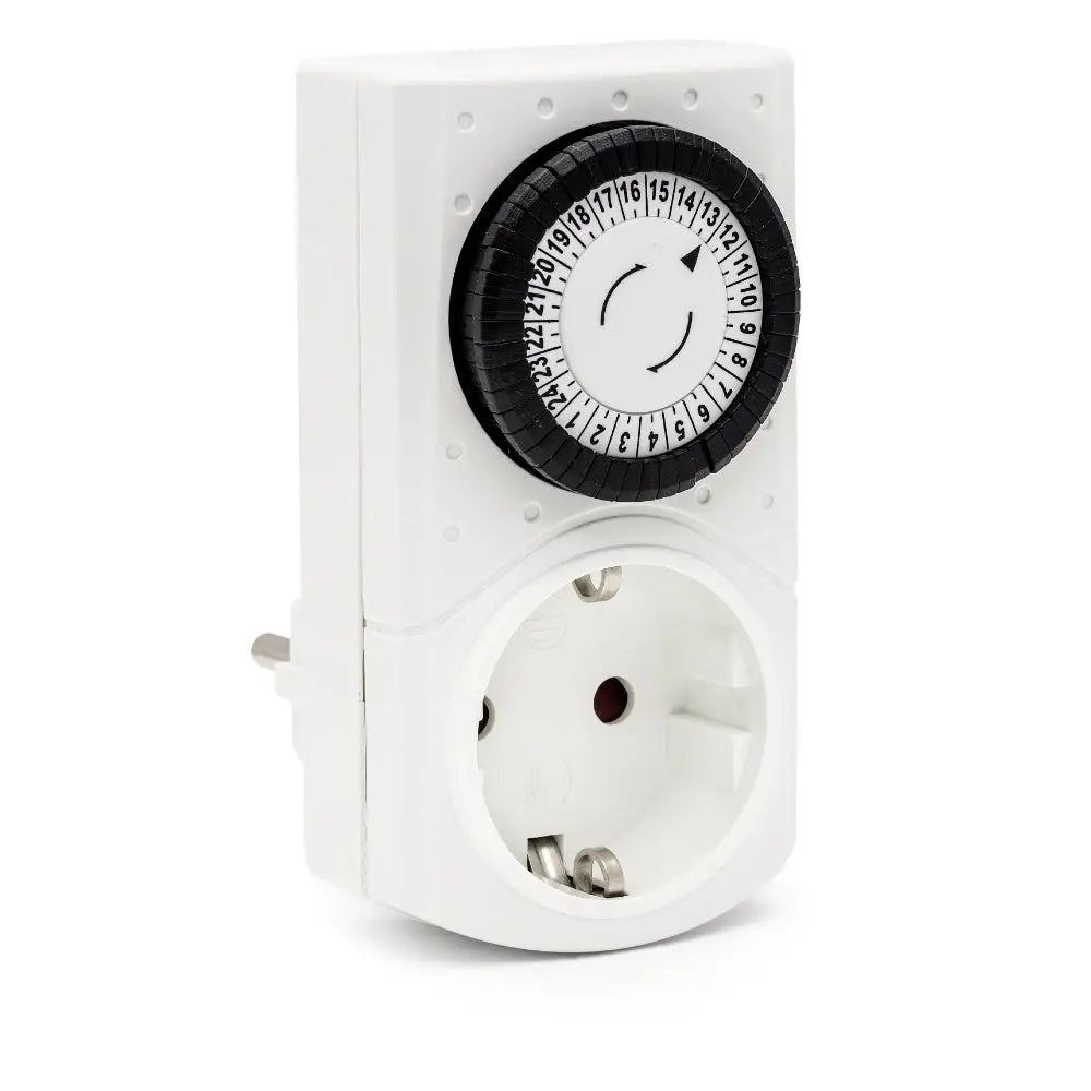 Mekanisk dygnstimer med 30 min intervall. Fasta segment som kan skjutas in eller dras ut för önskad kopplingstid. Finns i både jordat samt ojordat utförande. Knapp för fast tillslag eller timerdrift.