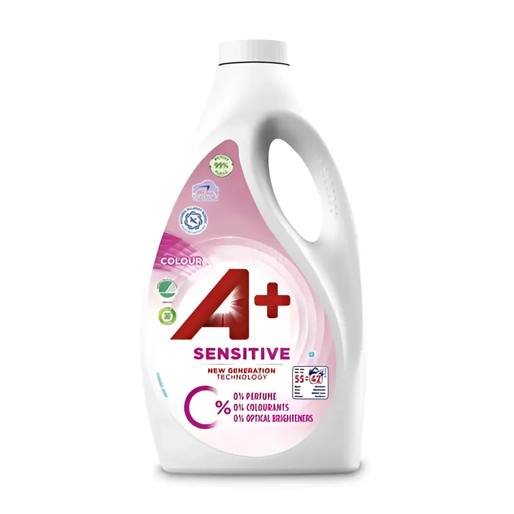 A+ Sensitive Colour Flytande Tvättmedel är utvecklat för dig med känslig hud och för att bevara färgerna på dina kläder. Den parfymfria och dermatologiskt testade formulan rengör effektivt utan att vara hård mot huden eller klädernas färgintensitet. Perfekt för familjer och personer med allergier eller känslig hud.