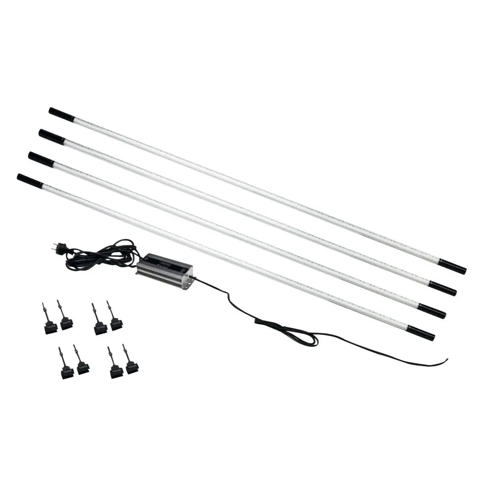 4 st 160 cm långa LED diodlysrör med tillhörande 80W strömförsörjningsenhet, 8 m kabel och kompletta monteringstillbehör. Medföljer clips att skruva fast. Som extra tillbehör finns även kraftiga flyttbara neodym magnetclips