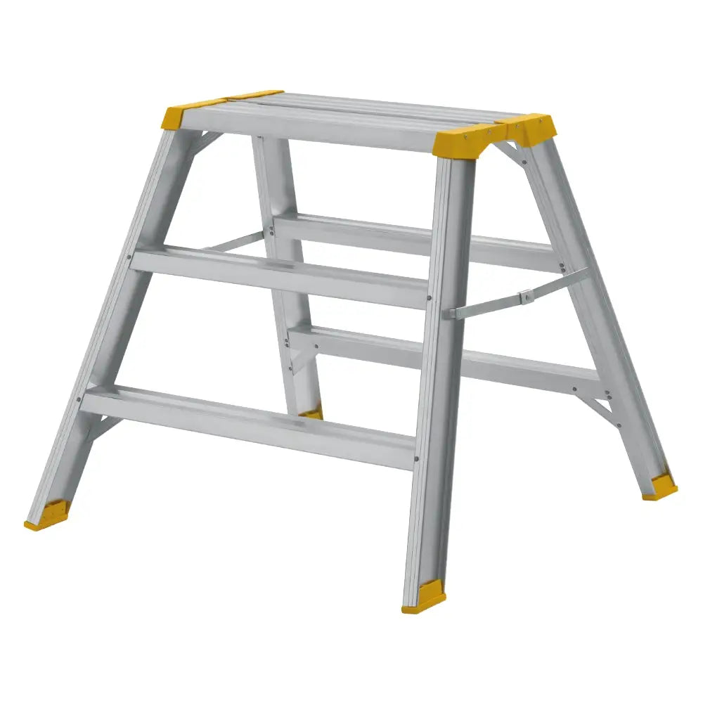 Stabil och säker arbetsbock som klarar höga påfrestningar och daglig använding. Utrustad med djupa, bekväma steg och en väl tilltagen ståplan. Allt för att ge dig ett riktigt hjälpmedel i arbetet. Den kraftiga aluminiumprofilen ger stabilitet utan att göra arbetsbocken tung. Stort ståplan på 300x620 mm. Har ett integrerat handtag vilket gör arbetsbocken lätt att bära. Två rejäla saxar och utsvängda ben ger arbetsbocken en mycket stabil konstruktion. Fotstegen är 80 mm djupa och räfflade för att ge dig ett bra halksydd. Topplattan har ändskydd i plast som hindrar saker, till exempel sladdar, att fastna i leden.