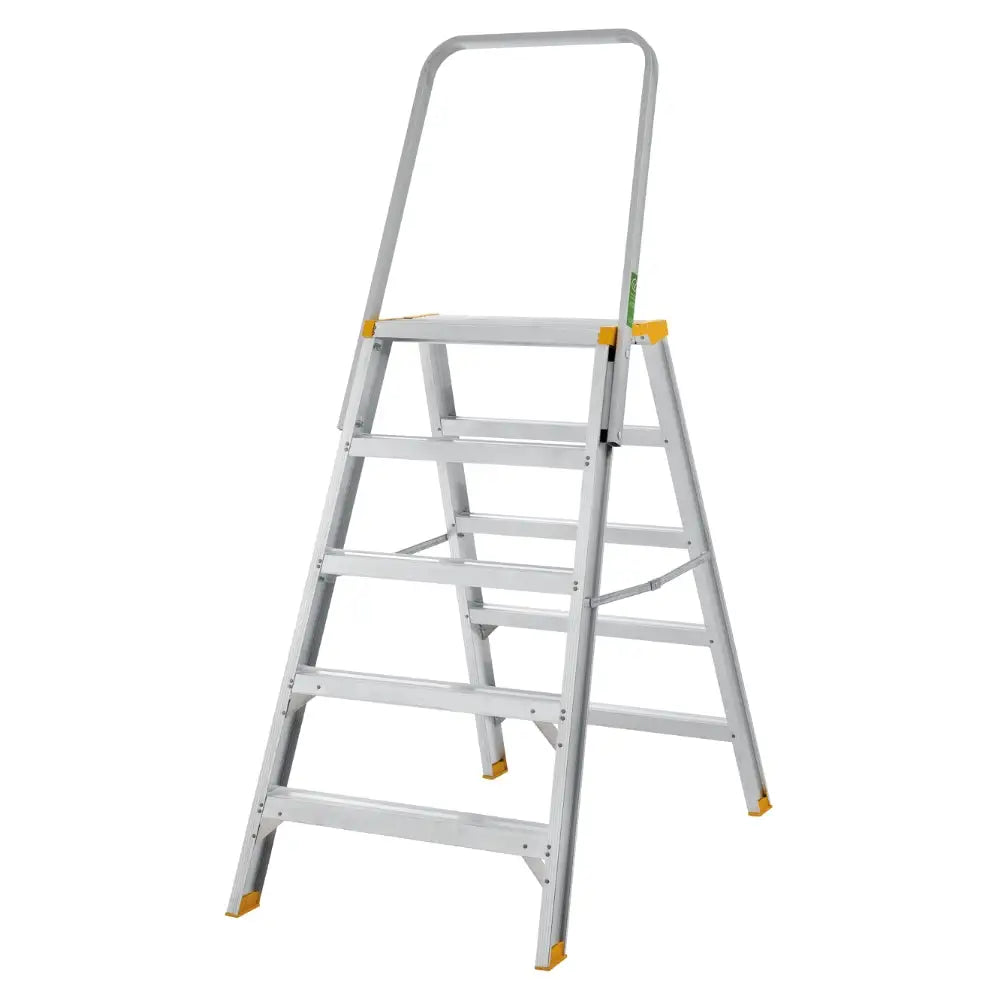 Räcket ger stöd och minskar risken att kliva ner på fel sida. Den kraftiga aluminiumprofilen ger stabilitet utan att göra arbetsbocken tung. Toppplattan mäter 250x600 mm och har ett integrerat handtag vilket gör arbetsbocken lätt att bära. Fotstegen är 80 mm djupa och räfflade för att ge dig ett bra halkskydd. Topplattan har ändskydd i plast som hindrar saker, till exempel sladdar, att fastna i leden.
