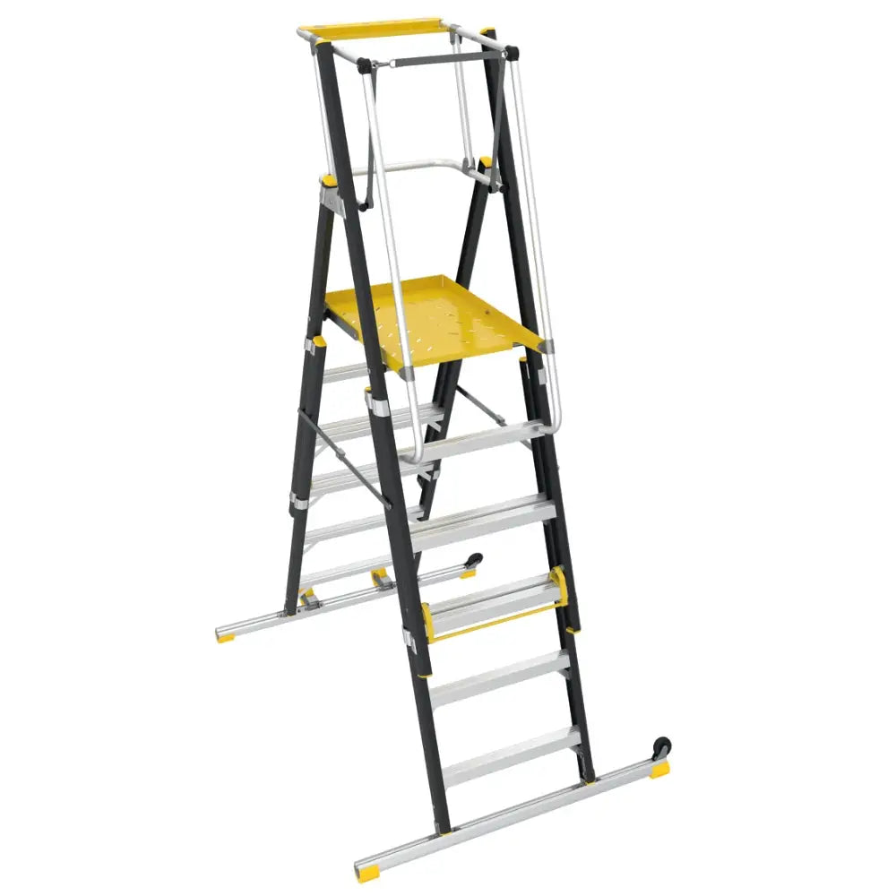 För ökad säkerhet och arbetskomfort på en högre nivå bör du använda en höjdjusterbar arbetsplattform. Enkel att justera, enkel att flytta runt för en optimal arbetsställning. Utvecklad för pålitlig stabilitet och ergonomi under långa arbetspass. Enkel att transportera tack vare integrerade hjul och kompakt format i hopfällt läge, dessutom ytbehandlad för att inte svärta ner händer och kläder. Stor ståyta (530x650 mm) gör att du kan byta arbetsställning ofta vilket ger bättre arbetsergonomi. Enkel höjdjustering med snabblåsning i fyra lägen (1100-1950 mm) säkerställer en optimal arbetshöjd. 50 mm djupa fotsteg (110 mm när de övre stegdelarna inte är utskjutna) för ökad stabilitet och säkerhet när du går upp och ner. Breda stegfötter, stabil halkskyddad ståyta och fallskydd på fyra sidor ger ökad säkerhet under arbetet.