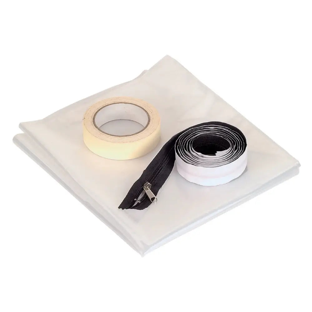 Avskiljningsvägg i plast som är lätt att fästa på väggen för att undvika damm etc. vid arbeten inomhus. Innehåller dragkedja, plast och dubbelhäftande tejp.