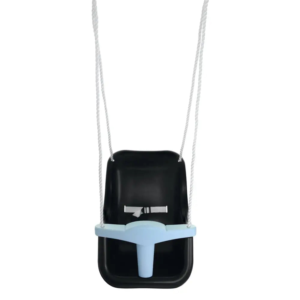 En stabil babysits med extra hög rygg och bra med plats för att få igenom barnets fötter. Säkerhetssele och rejäla upphängningsringar medföljer och det är en mycket säker infästning av repen i sitsen. Sitsen passar att hänga upp i alla gungställningar. CE-märkt och godkänd enligt Lekstandard EN-71 för lek i den privata trädgården.
