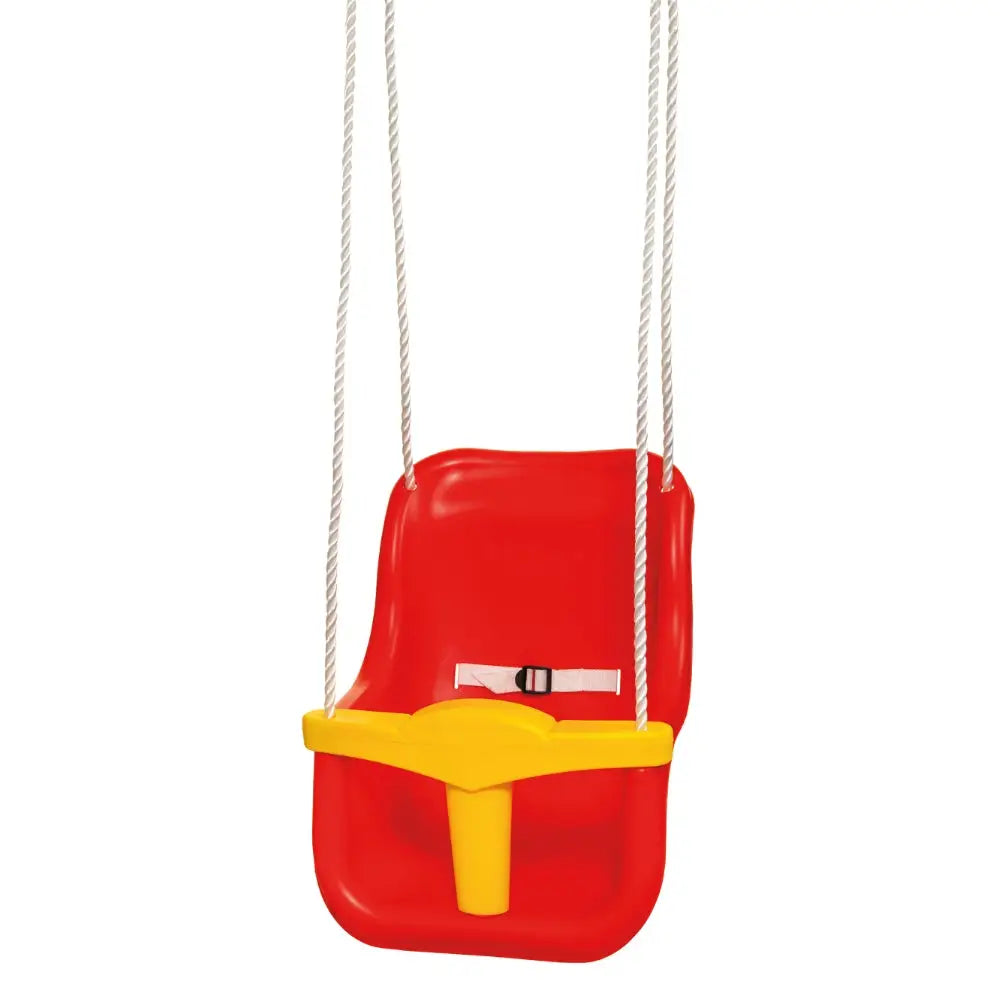En stabil babysits med extra hög rygg och bra med plats för att få igenom barnets fötter. Säkerhetssele och rejäla upphängningsringar medföljer och det är en mycket säker infästning av repen i sitsen. Sitsen passar att hänga upp i alla gungställningar. CE-märkt och godkänd enligt Lekstandard EN-71 för lek i den privata trädgården.