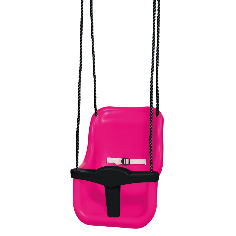 En stabil babysits med extra hög rygg och bra med plats för att få igenom barnets fötter. Säkerhetssele och rejäla upphängningsringar medföljer och det är en mycket säker infästning av repen i sitsen. Sitsen passar att hänga upp i alla gungställningar. CE-märkt och godkänd enligt Lekstandard EN-71 för lek i den privata trädgården.