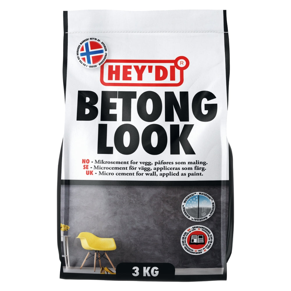 BetongLook för vägg. En cementburen produkt som appliceras som färg. Produkten är uppbyggd på vit specialcement, vitt marmormjöl, stenmjöl samt tillsatsmedel. Hey'di BetongLook blandas med vatten och ger en yta som ser ut som en gjuten betong.