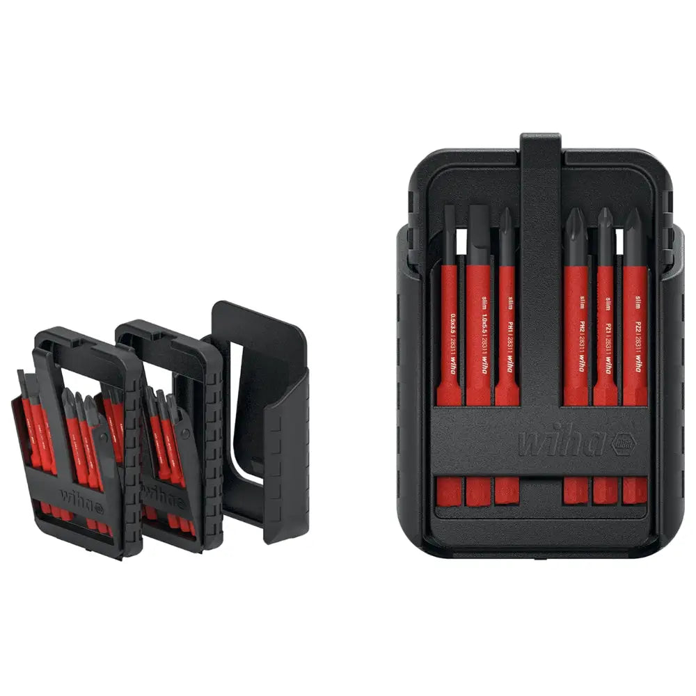 SlimBit-bitsen förvaras i två bitboxar som är kombinerade med varandra och där skruvprofilerna visas på ett optimalt sätt. slimBit-lådorna är perfekta att ha med sig tack vare den medföljande bältesklämman. Kontrollerad enligt IEC 60900.