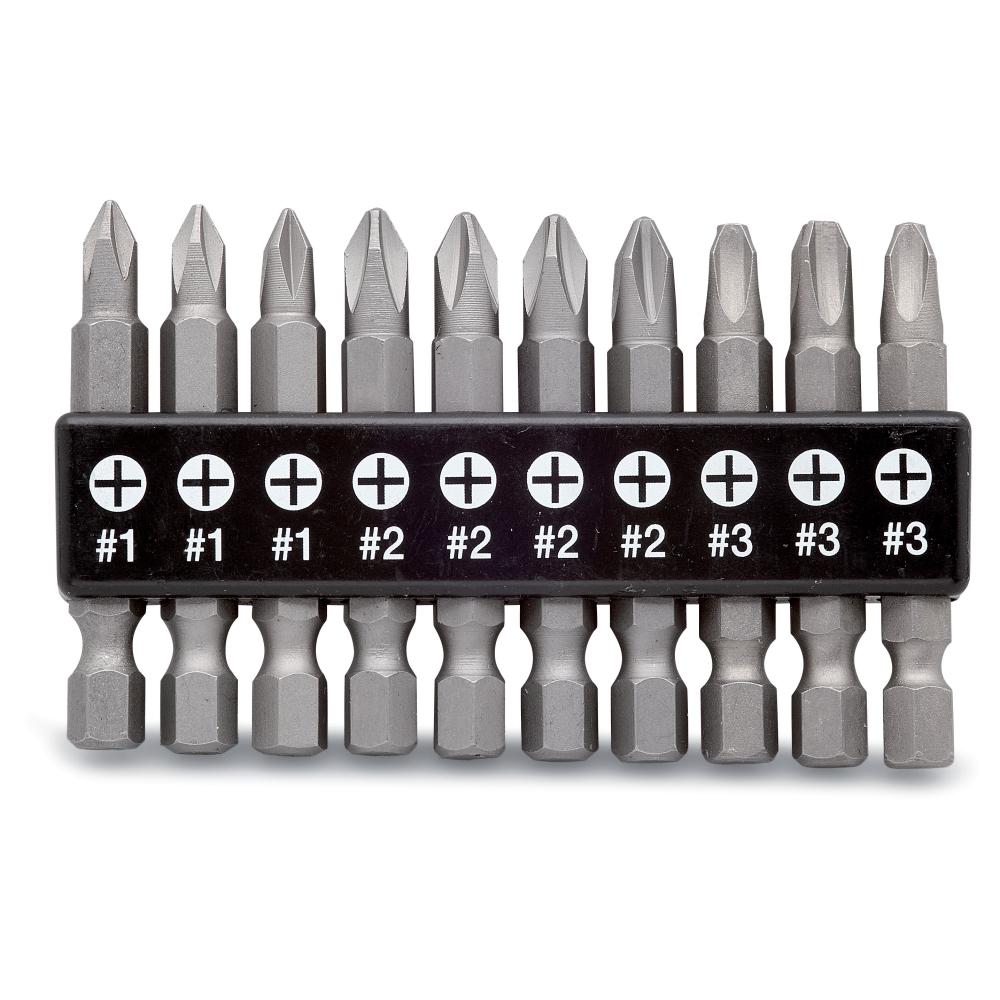 Bitssats i 10 delar. Alla bitsen är tillverkade av kromvanadiumstål. Levereras med praktisk bitshållare. Innehåller phillipsbits: nr 1 (3 st), nr 2 (4 st) och nr 3 (3 st).