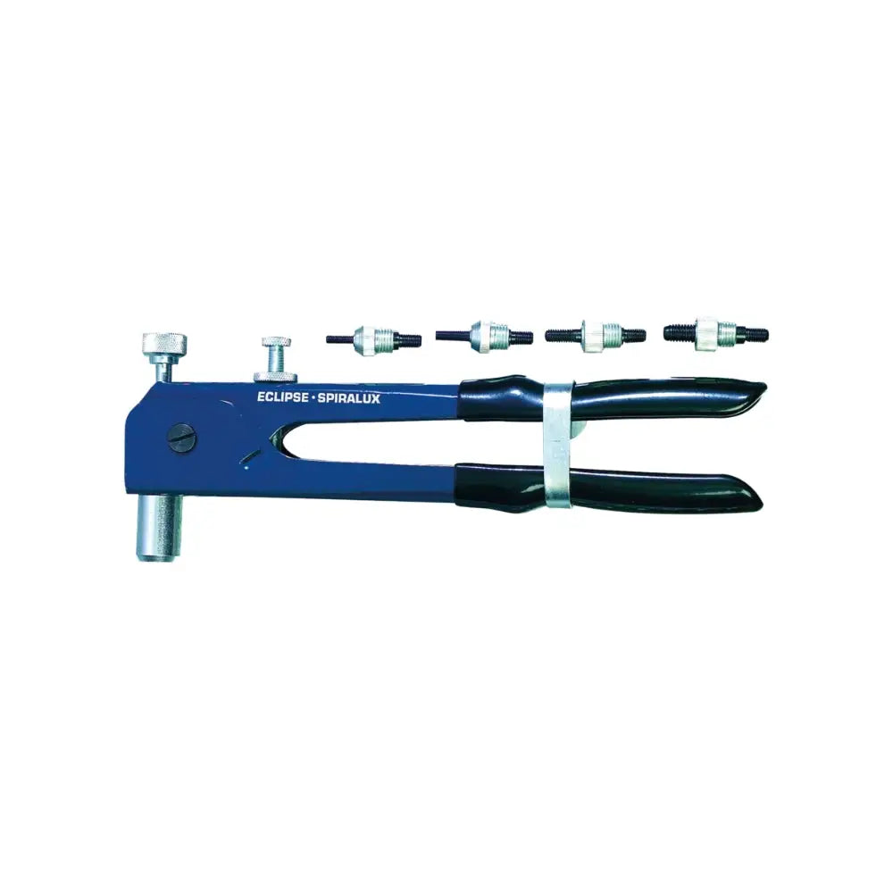 Blindnittång i robust och slitstarkt utförande för blindnitar där de olika munstyckena och dragbultarna är utbytbara för växling mellan olika gängdimensioner.