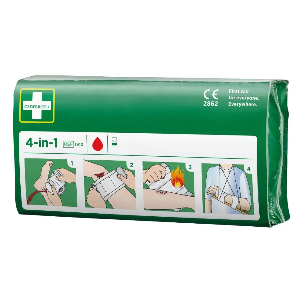 Sterilt universalförband med 4 funktioner: tryck-, stöd-, täck- och brännskadeförband. Innehåller: 1 st kompress (14 x 23 cm) och 2 st elastiska bindor (10 cm x 3 m). Tydliga instruktioner på förpackningens insida.