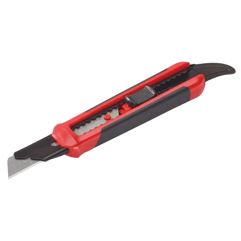 Ergonomisk. Kniven är allsidig och passar bra för att skära i gips, isolering, våtrumsskivor och trä. Knivens design med grepp i gummi gör att den passar för material som kräver mer kraft. Avsmalnad knivspets och förlängd framdel på bladskenan ger bättre stabilitet, åtkomst och sikt. Den böjda fenan trycker effektivt ner mattkanter eller öppnar burkar. Är gjord av hållbar PC-plast (polykarbonat) med stålkärna för extra stabilitet. Skena i 1 mm tjock metall för ytterligare stabilitet.
