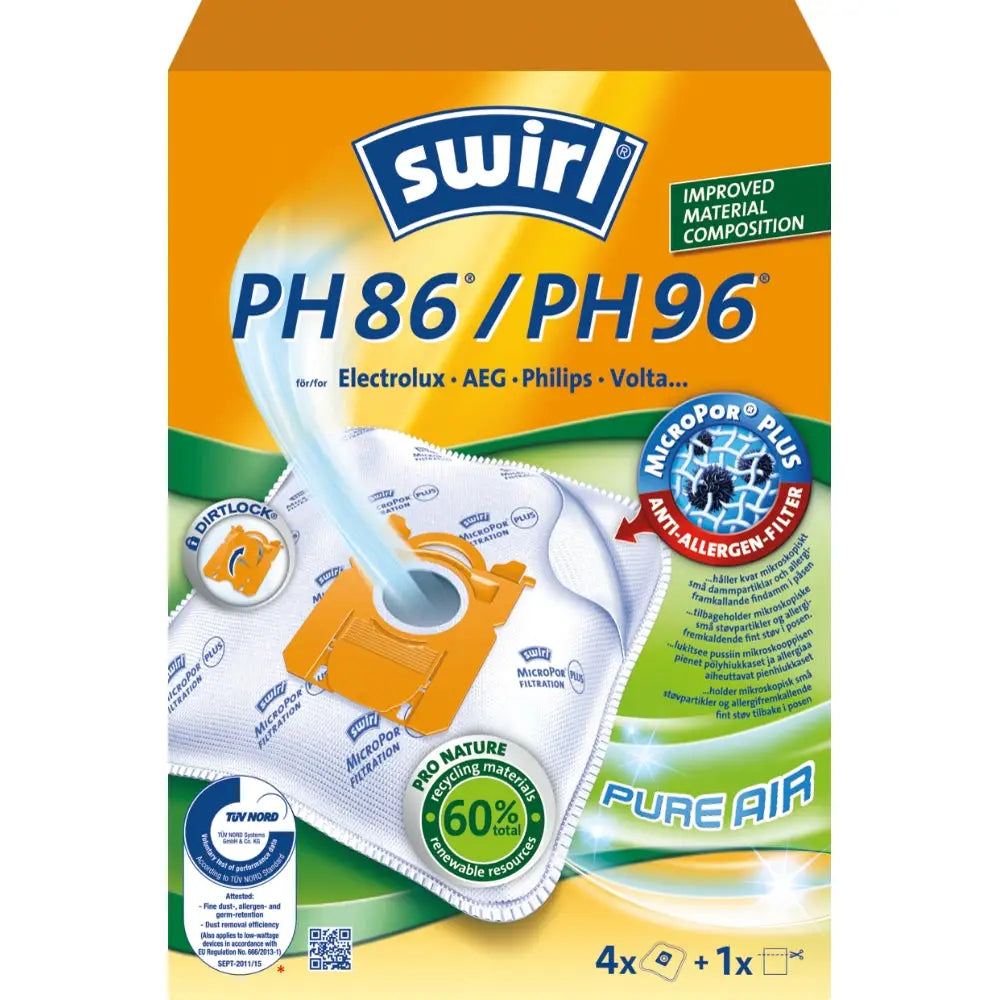 Dammsugarpåsar märkta med Pro Nature symbolen är tillverkade av minst 45% återvunnet material och förnybar råvara. På detta sätt bidrar Swirl till att skydda miljön och bevara naturens resurser. Swirl MicroPor Plus-kvalitet är certifierad av TÜV.