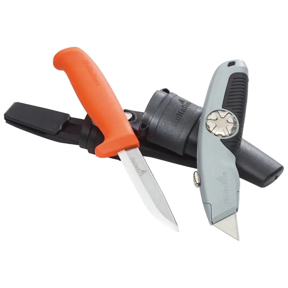 Med dessa knivar nära till hands är du väl utrustad för alla typer av jobb. Med ett dubbelhölster har du alltid tillgång till de två knivar du använder mest och ditt arbete blir effektivt utfört. Dubbelhölstret är gjort i slagtålig PP-plast som sammanfogats med en nit och ett elastiskt förband. När knivarna är utslitna behåller man hölstret och kompletterar med nya knivar. Ett mycket bra sätt att minimera vår klimatpåverkan.