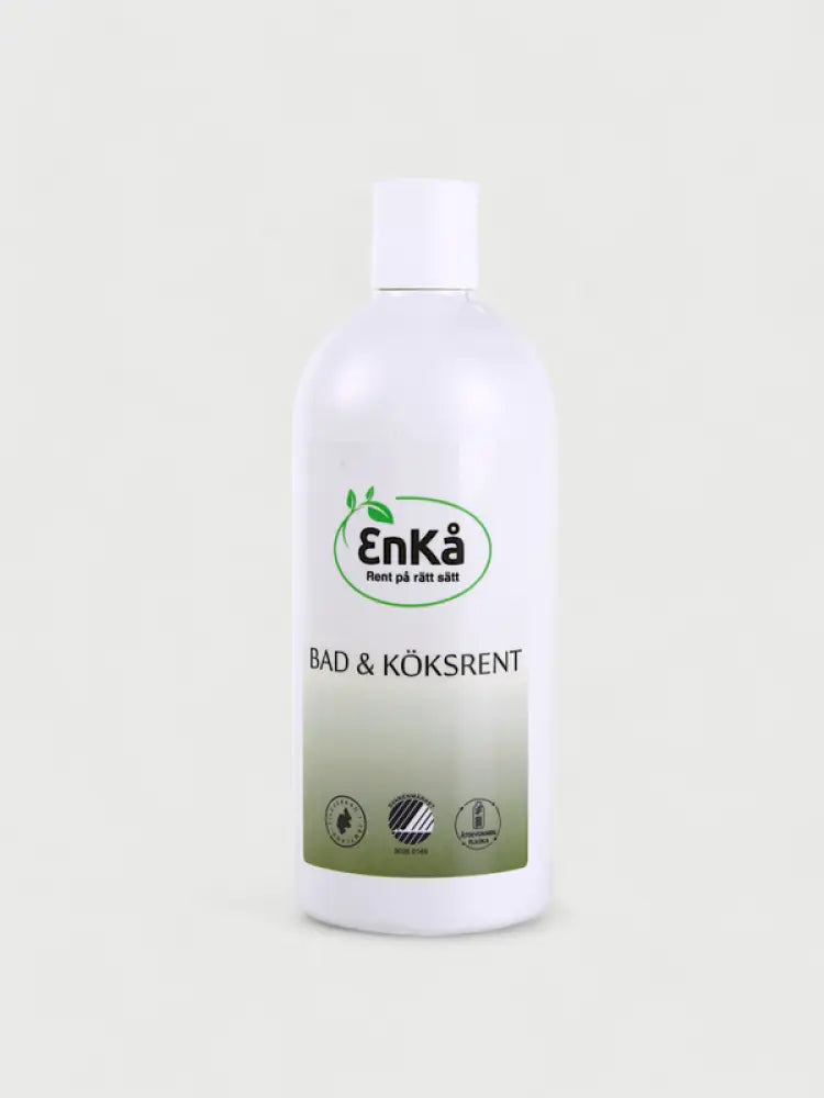 EnKå Bad & Köksrent är ett multifunktionellt, koncentrerat rengöringsmedel som effektivt rengör ytor i både kök och badrum. Produkten är skonsam för både människor, material och miljön och innehåller Bio Gen Active® – ett 100% naturligt ämne baserat på vassle.