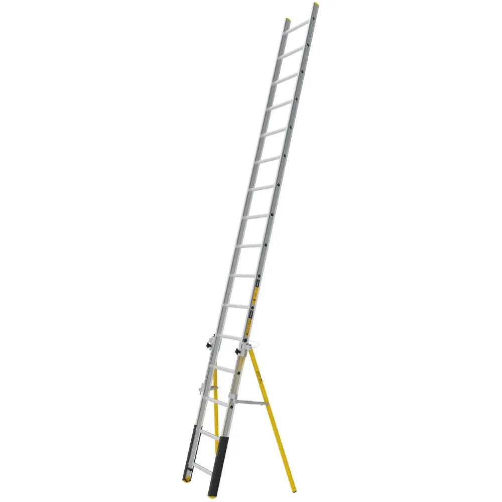 Säkerhetsbenen motverkar att stegen faller i sidled och att basen faller undan. Stegarna är extra breda, 485 mm, vilket ger användaren bättre räckvidd och gott om plats för att klättra bekvämt och säkert. En stark BOX-profil i aluminium med kraftiga infästningar gör stegen stabil och stegpinnarna har dubbelriktat halkskydd.