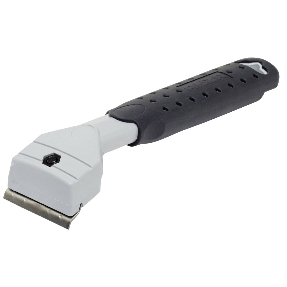 Färgskrapa med vändbart skär, flyttbart i sidled. Ergonomiskt skaft i tvåkomponentsmaterial.