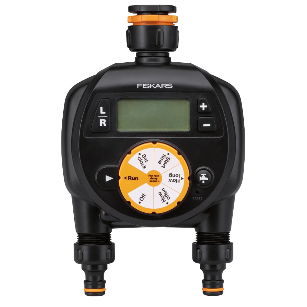 Tids- och vattenbesparande timer med 2-vägskoppling för bevattning av trädgårdar och gräsmattor.