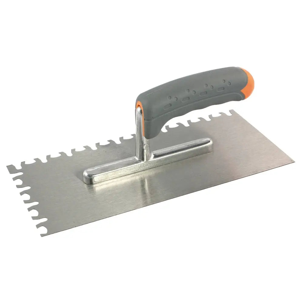 Fixkam med Softgriphandtag för ett mer ergonomiskt grepp. 130x280 mm stålblad med specialtandning på en lång- och kortsida. För maximal täckning under plattorna. För t.ex. flytfix.