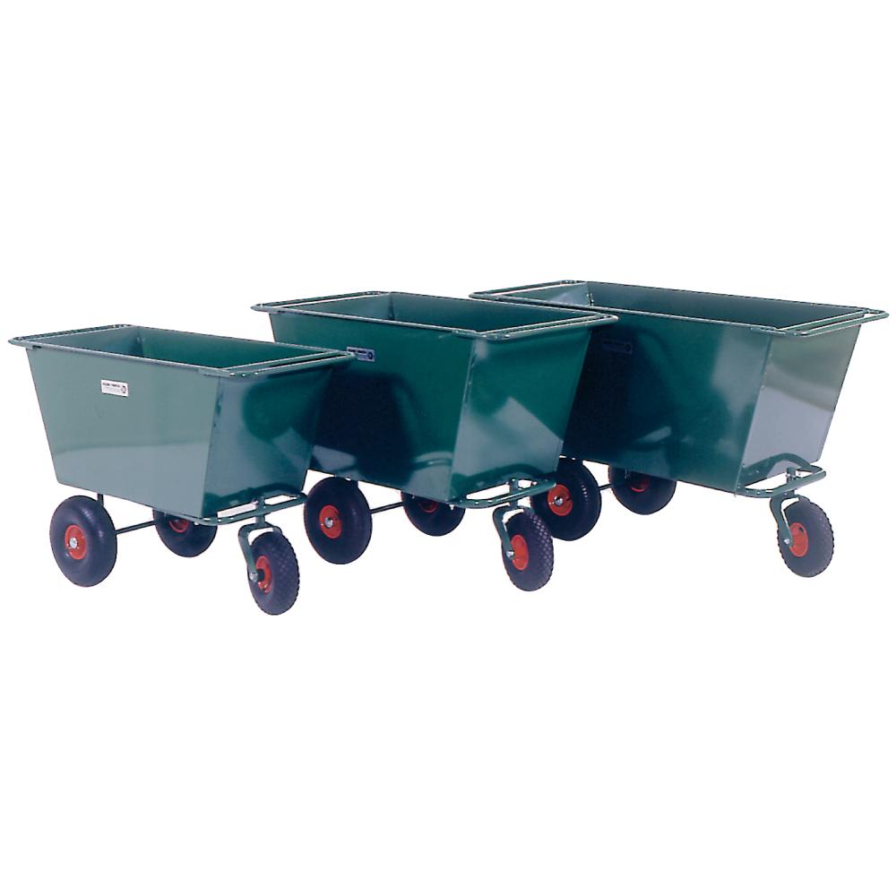 En hel serie fodervagnar i volymerna 200, 300 och 400 liter. Robust konstruktion med vridstyva underreden. Kan erhållas med tre eller fyra hjul, två fasta och ett respektive två länkhjul. Finns med punkteringsfria- eller luftgummihjul. Draghandtag i båda ändar. Levereras omonterade. Ytbehandling: Pulverlack.