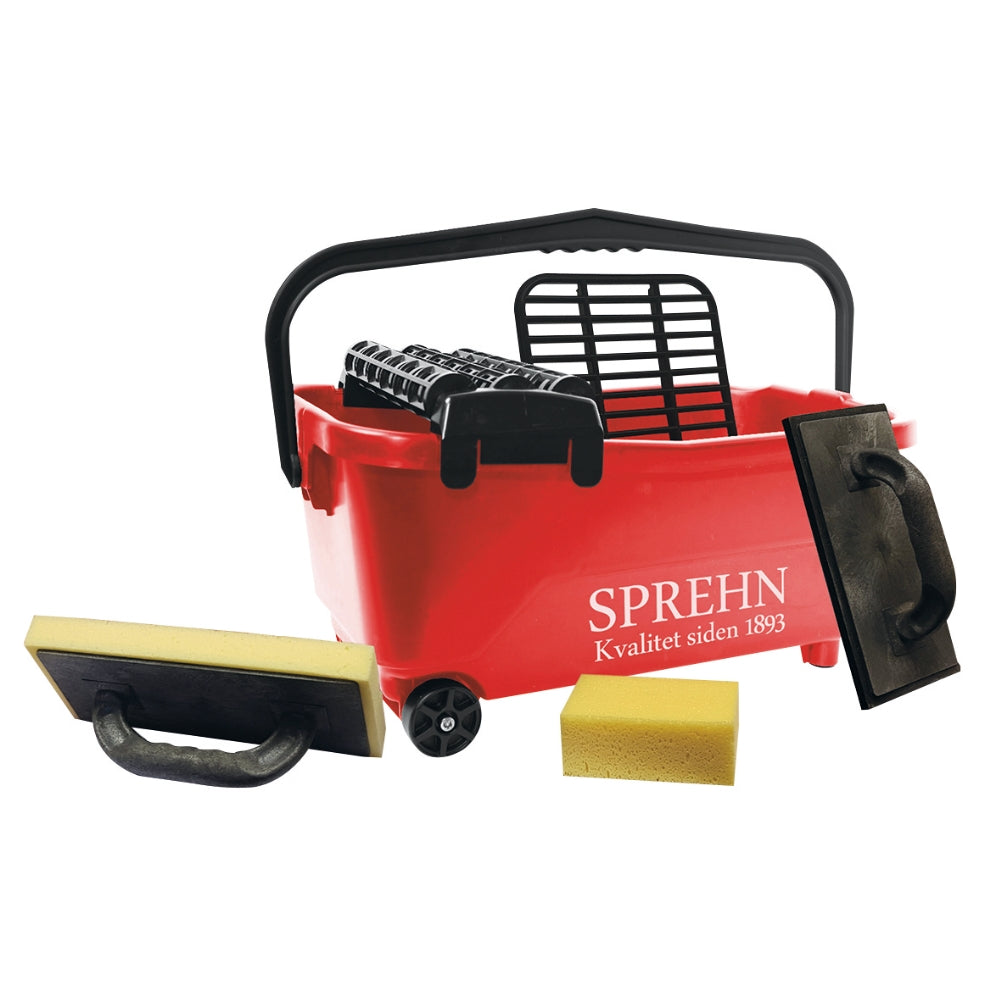 Fog och rengöringsset med 6 delar i kraftig balja med dubbla fast monterade hjul är ett komplett set för både fogning och rengöring av byggkeramiska plattor.