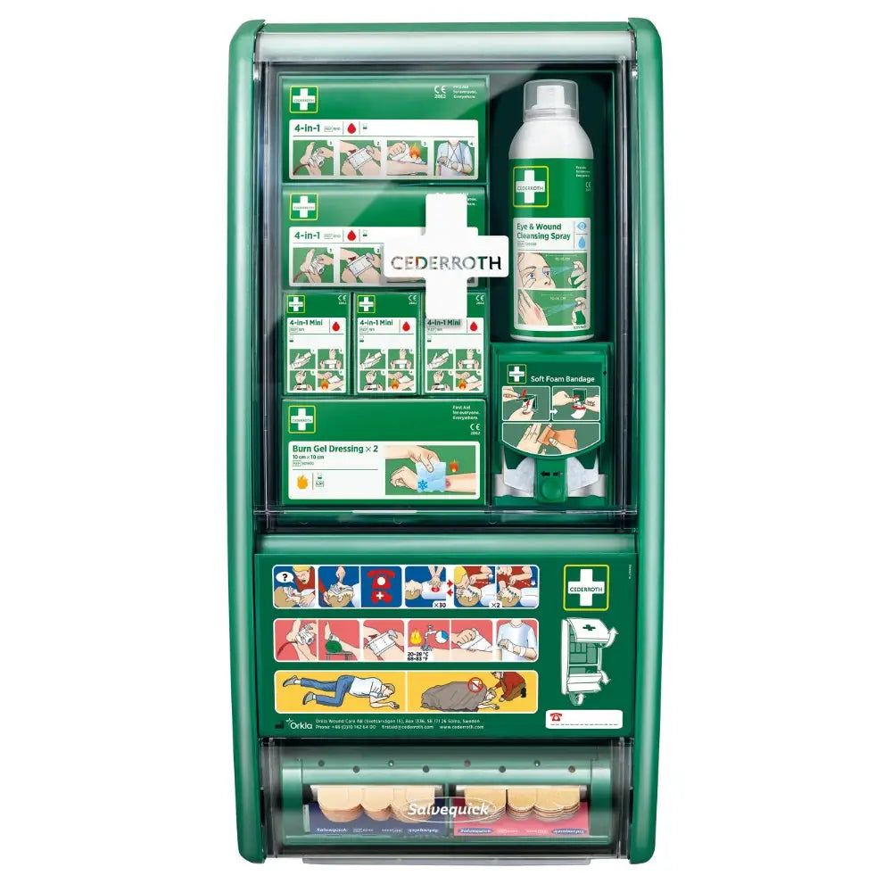 Första Hjälpen-station med produkter för de flesta typer av skador som sår- eller brännskador. Nu även med integrerad Soft Foam Dispenser 2 meter. Transparent lucka skyddar mot damm och fukt. Plåsterautomat med refillnyckel. Extra förvaringsutrymme för eget tillval av produkter.