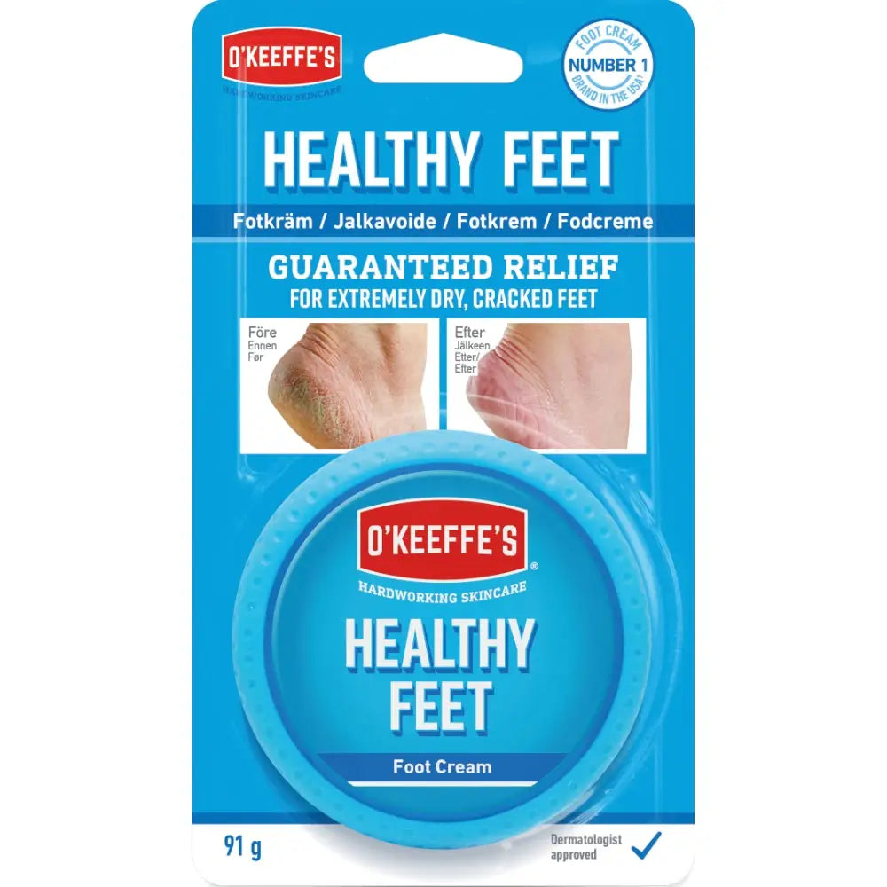 O'Keeffe's Healthy Feet är en fotkräm. Mjukar effektivt upp torra fötter, stimulerar hudens naturliga reparationsprocess genom återfuktning, justerar pH-balansen och hjälper huden att bibehålla fukten. Svåra sprickor och extremt torra partier repareras och lindras effektivt med Healthy Feet.