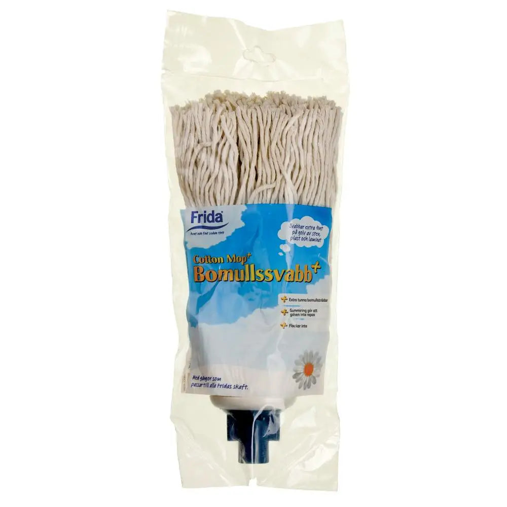 Bomullssvabb Frida Plus är en effektiv och smidig svabb som passar alla Fridas skaft och mopphinkar. Den är designad med extra tunna bomullstrådar som absorberar mer och flockar mindre än en vanlig bomullssvabb. För bästa resultat bör svabben fuktas och vridas ur ordentligt innan användning. Gummiringen på mopphuvudet skyddar golvet från repor, vilket gör den särskilt bra för golv av sten, plast och laminat. Svabben kan maskintvättas i 60°C för enkel rengöring och lång hållbarhet.