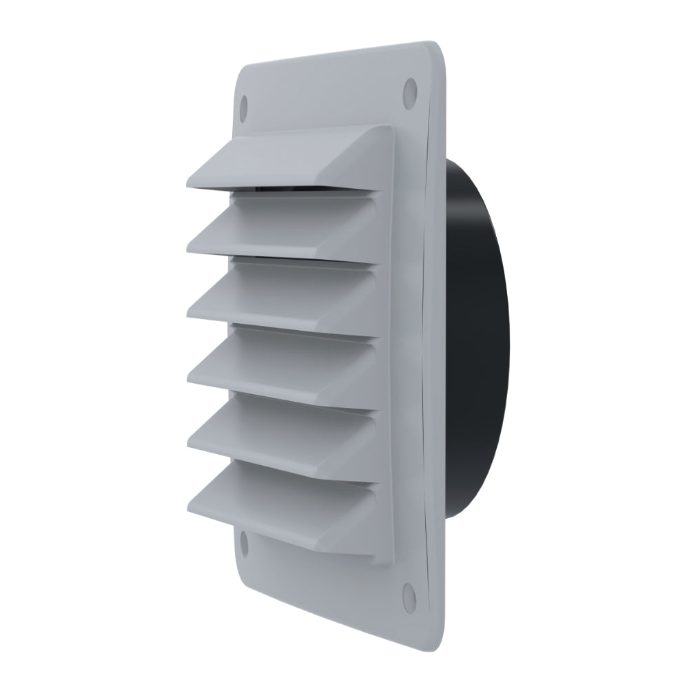 Fyrkantigt ytterväggsgaller med stos. Anpassat för ventiler och avsett att användas på utvändig vägg, försett med dolda skruvhål för skruvmontage.