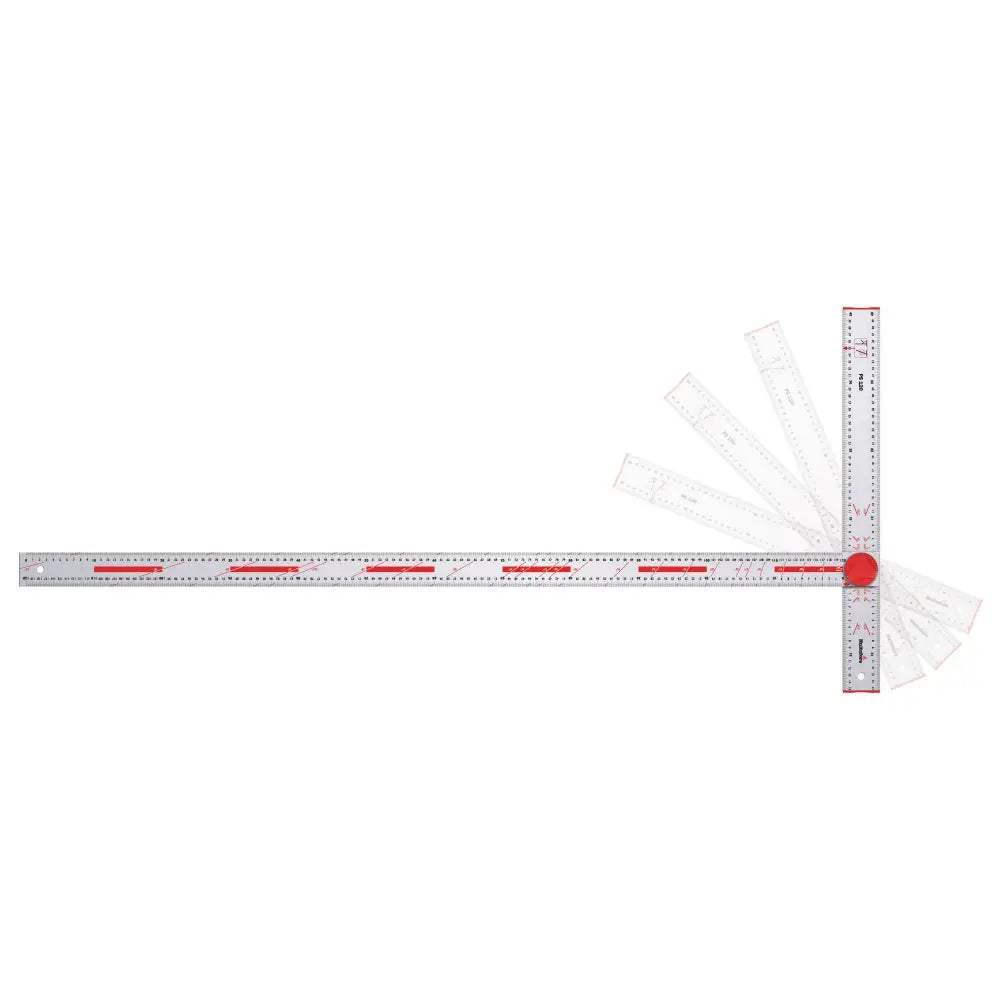 Ställbar gipsvinkel med millimeter och gradgradering som kan ställas i fyra fasta lägen. Anslag och blad kan vikas ihop, vilket gör den enkel att förvara och transportera. Anslaget går att vrida mellan höger och vänster position. 4 vinklar med fasta lägen (22.5°, 45°, 67.5°, 90°). Ytterligare 21 vinklar är markerade på skalan.