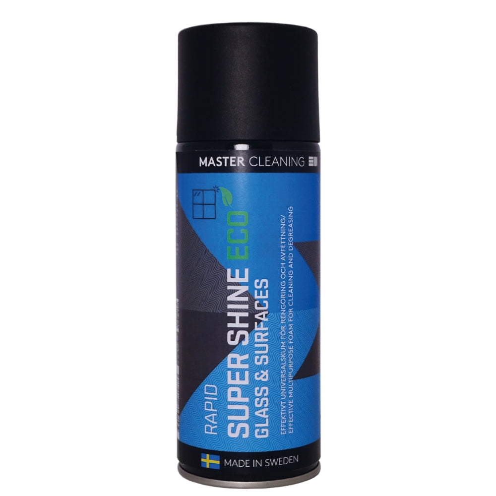 Master Rapid Super Shine Glass & Surfaces är en av Spray Masters Eco-brandade produkter som lever upp till högt ställda krav gällande hälsa, miljö och prestanda och är ett skumrengöringsmedel utan slipmedel med kraftfull effekt på både hårda och mjuka material.