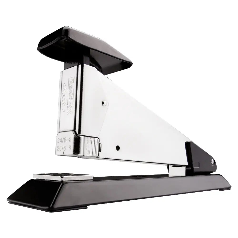 Extremt slitstark stålkonstruktion av hög kvalitet. Justerbart städ för stängd eller öppen häftning. Tar helstapel, 210 klammer 26/6-8. Häftar upp till 50 ark. Häftdjup: 105 mm. 5 års garanti.
