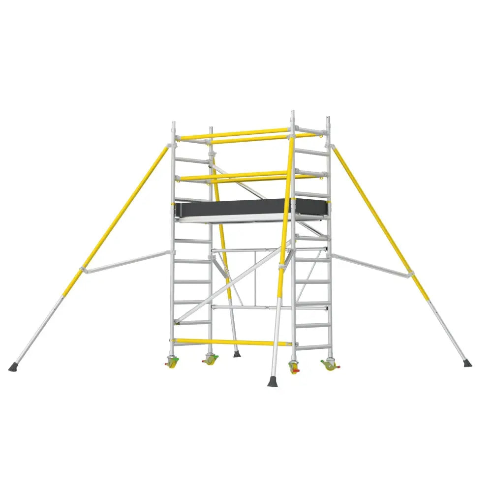 Spannställning (0,75x1,8 m) med fällbar bassektion för smidig hantering och transport. Stagas överlappande för extra säkerhet och stabilitet. Komplett plattform och lutande trappstege varannan meter upp till toppen, låsbara hjul (125 mm), sparklist och stödben. Extra säker montering tack vare överlappande stagning och extra plattform varannan meter. Mjukt formade profiler, låsklor med ergonomiskt två-finger-grepp och färgkodade delar för enklare transport, hantering och montering. Stabil arbetsyta (1,7x0,6 m) med sparklist på översta plattformen. Kan enkelt byggas på till önskad höjd med påbyggnadspaket.