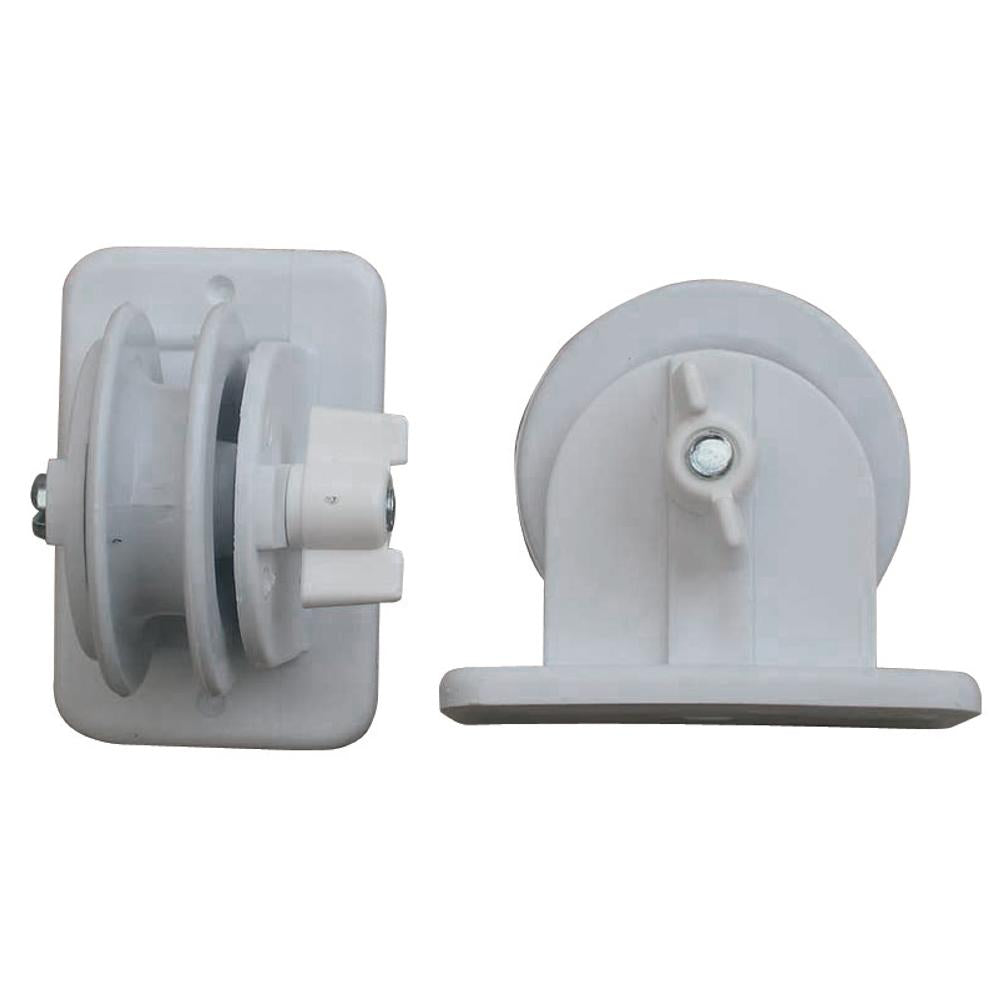 Lösa hissblock (för torkhiss) för montering med skruv direkt i tak (byglarna är av rostfritt stål). Blockskivorna och knoppen för hisslinan samt täckbrickorna är av plast.