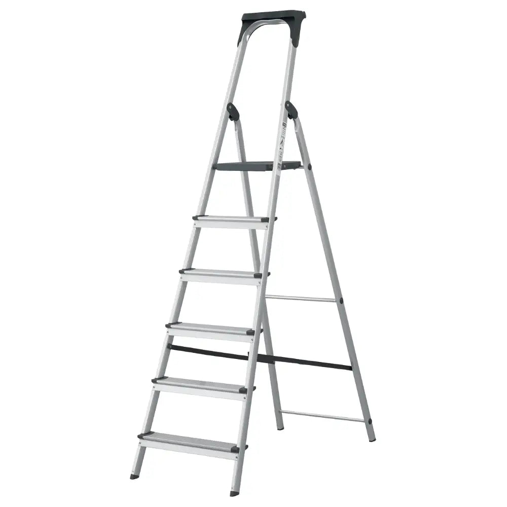 Denna anodiserade trappstege är perfekt att ha i hemmet, till exempel när det ska målas, sättas upp tavlor eller läggas in saker i höga skåp. Lätt att använda, fälla ihop och bära med sig. Aluminiumet är anodiserat för att säkerställa att du ej svärtar händer eller kläder. Plattformen längst upp ger dig en stor yta både att stå på och lägga saker på. I utfällt läge fungerar plattformen som lås och ger stegen en god stabilitet. Fotstegen är räfflade och halksäkrade för att du ska kunna klättra säkert. Utrustad med en komfortabel och praktisk verktygshylla.