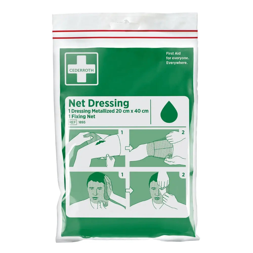 Net Dressing. Avsedd för skador på huvudet, lämpligt även för att lägga förband på armar och ben. Sterilt förband med metalliserad yta som inte fastnar i sår. Förbandet hålls på plats genom ett tubformat elastiskt fästnät.