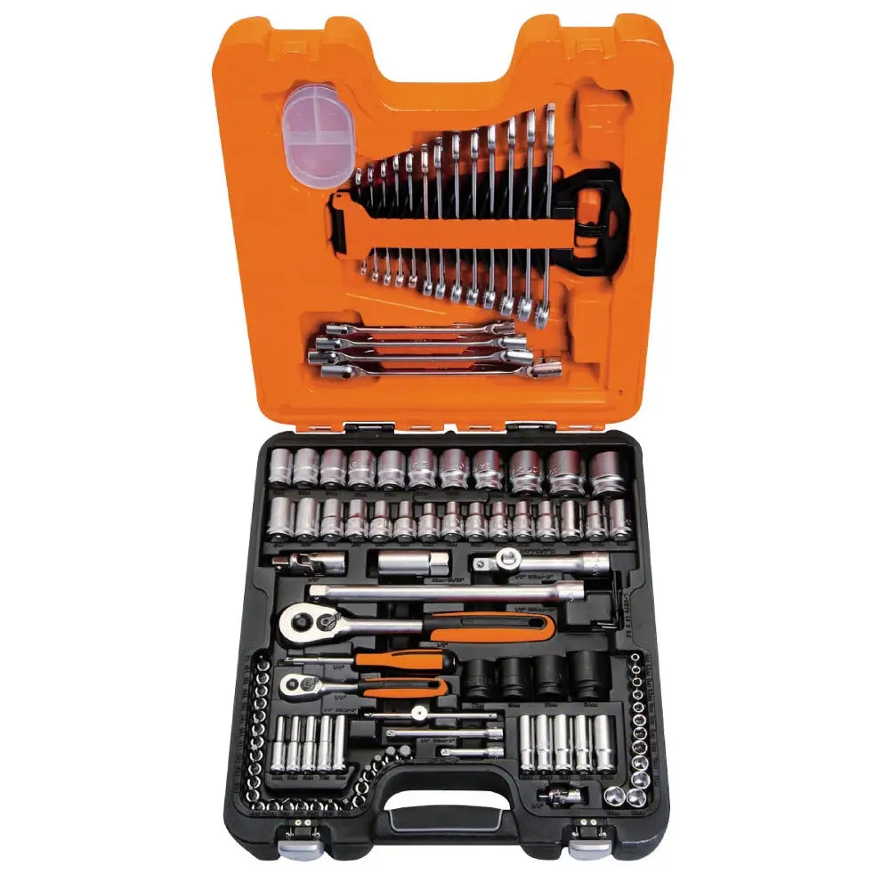 Hylsnyckelsats 1/4" och 1/2". ISO 1174 . DIN 3120 . Verktyg av mattförkromat högkvalitativt stål. Väska i HDPE plast. Innehåller 108 delar: 12 st 1/4" 6-kanthylsor med Dynamic Drive profil: 4, 4,5, 5, 5,5, 6, 7, 8, 9, 10, 11, 12, 13 mm. 10 st 1/4" 6-kanthylsor, långa, med Dynamic Drive profil: 4, 5, 6, 7, 8, 9, 10, 11, 12, 13 mm. 20 st 1/2" 6-kanthylsor med Dynamic Drive profil 8, 9, 10, 11, 12, 13, 14, 15, 16, 17, 18, 19, 20, 21, 22, 23, 24, 27, 30, 32 mm. 6 st Torx-hylsor: E12, E14, E16, E18, E20, E24. 4 st 1/2" 6-kant krafthylsor: 17, 19, 21, 24 mm. 4 st 1/4" bitshylsor Phillips PH 1, 2, 3, 4. 3 st 1/4" bitshylsor Pozidriv PZ 1, 2, 3. 3 st 1/4" bitshylsor spår 4, 5,5, 7 mm . 6 st 1/4" bitshylsor Insex 3, 4, 5, 6, 8, 10 mm . 8 st 1/4" bitshylsor Torx 8, 10, 15, 20, 25, 27, 30, 40. 2 st 1/4" förlängare 50 mm och 100 mm. 1 st 1/4" T-stånghandtag 100 mm. 1 st 1/4" universalknut. 1 st 1/4" vridhandtag. 1 st 1/4" spärrhandtag 60 tänder, 6° omtagsvinkel. 2 st 1/2" förlängare 125 mm och 250 mm. 1 st 1/2" universalknut. 1 st 1/2" tändstifthylsa 6-kant 21 mm (13/16"). 1 st 1/2" t-mellanstycke. 3 st 1/2" insexnycklar 1,5, 2, 2,5 mm. 1 st 1/2" spärrhandtag 60 tänder, 6° omtagsvinkel. 4 st ledhylsnycklar: 8-9, 10-11, 12-13, 14-15 mm . 13 st u-ringnycklar: 7, 8, 9, 10, 11, 12, 13, 14, 15, 16, 17, 18, 19 mm.