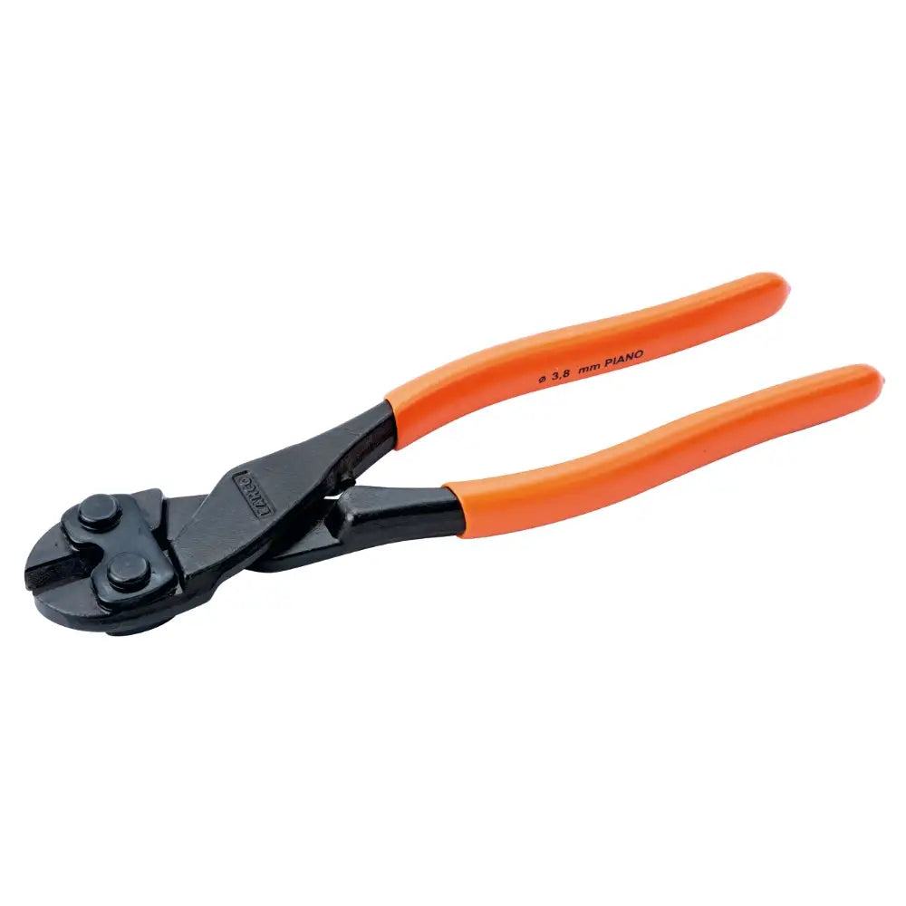 Kraftavbitare med centrerade skär för bästa precision. Mellanting mellan sidavbitare och bultsax. Eggdesign för klippning av hårda trådar. Tunna starka käftar. Hög utväxling. Ytbehandling: Svartoxiderad. Antirost behandlad. Material: Chrome-vanadium stål. PVC-doppade handtag. Klippkapacitet: 3,8 mm pianotråd.