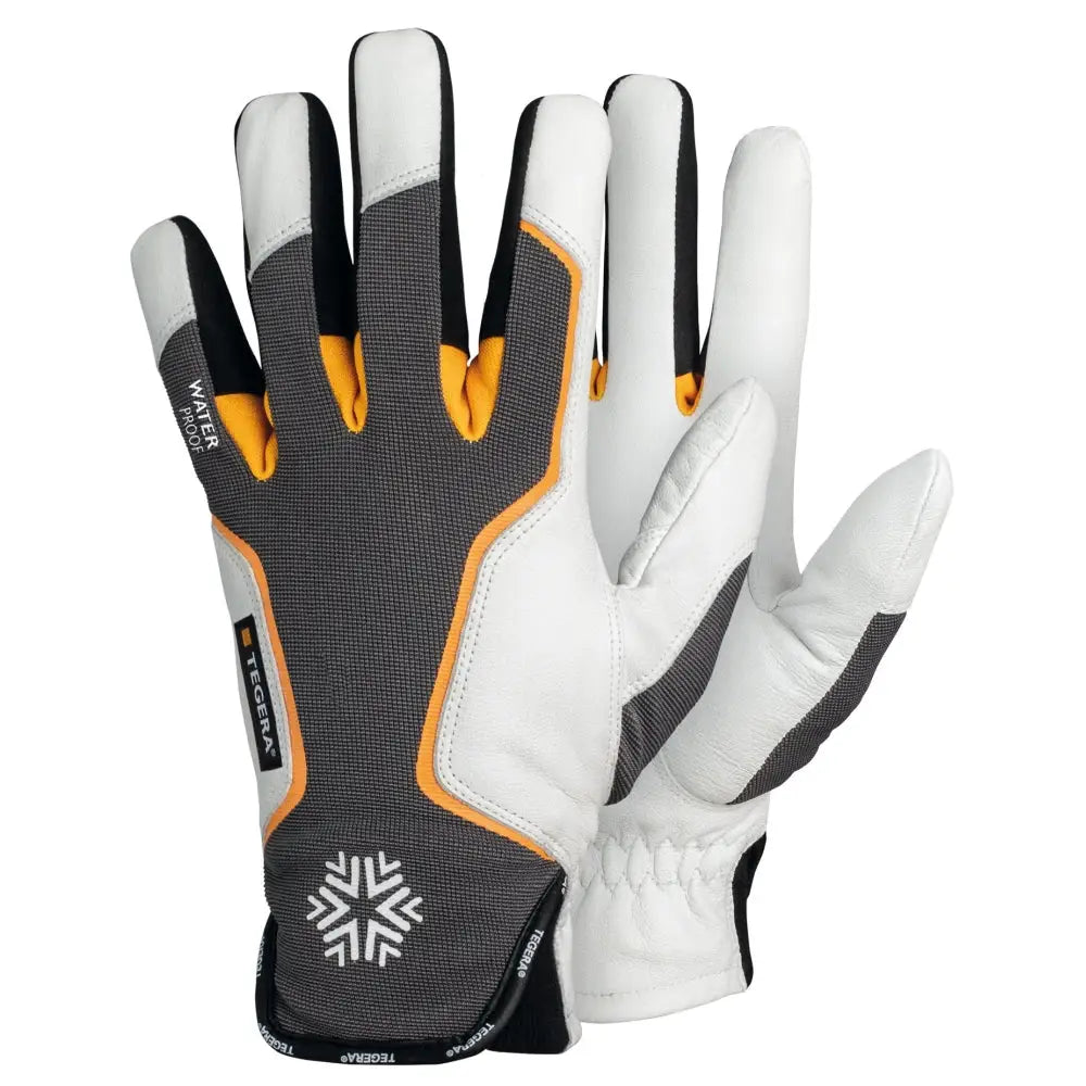 Varmfodrad vattentät läderhandske . 0,7-0,8 mm getnarv/spandex. Thinsulate 40 g. Cat. II. Vit och grå. Resår 180°. För allroundarbeten.