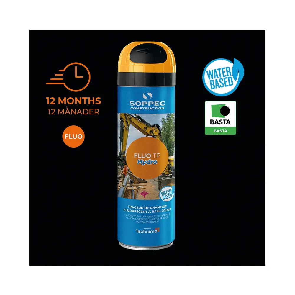 Soppec Hydro TP är en ny miljövänlig vattenbaserad (20% vatten) märkfärg och en högkvalitativ fluorescerande markeringsfärg med mycket god vidhäftningsförmåga och används där kravet på synbarhet är stor.