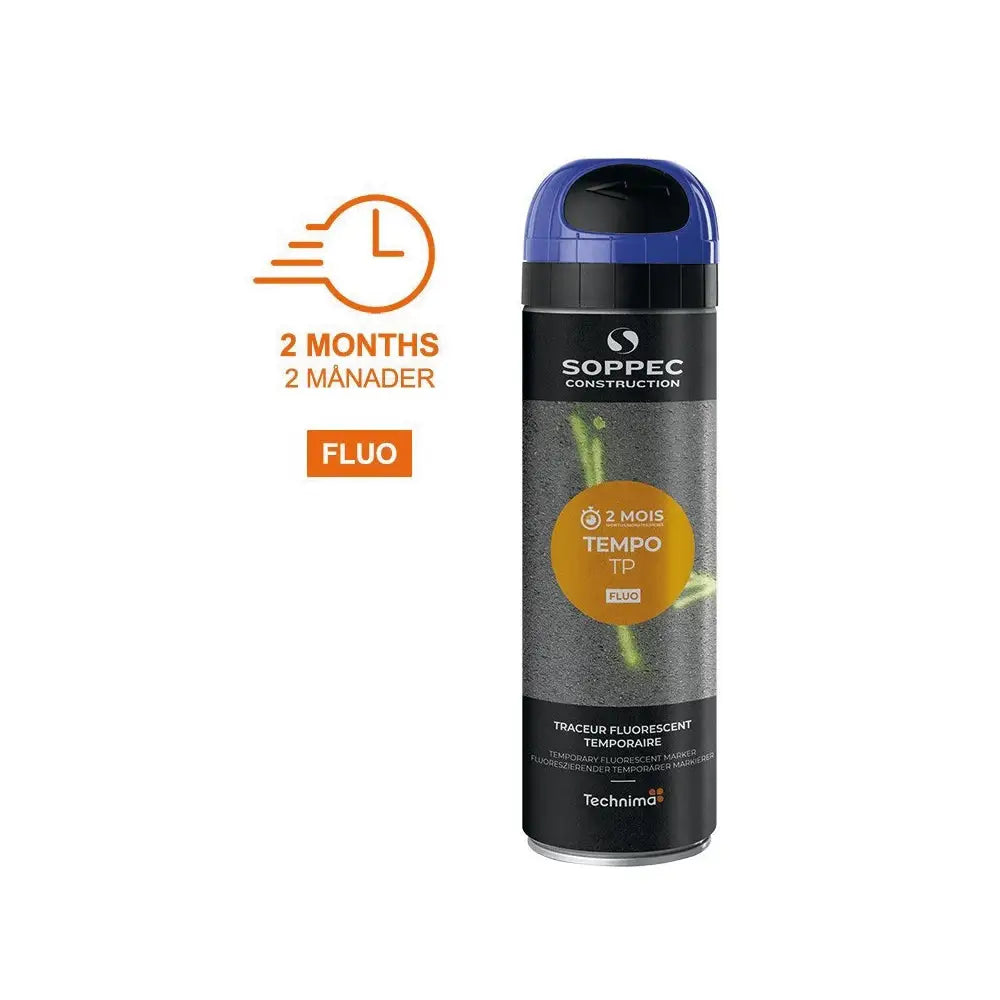Soppec Tempo TP är en högkvalitativ fluorescerande temporär (upp till 2 månader) kritbaserad markeringsfärg med mycket god vidhäftningsförmåga och används där kravet på synbarhet är stor men där kravet på lång varaktighet inte behövs.