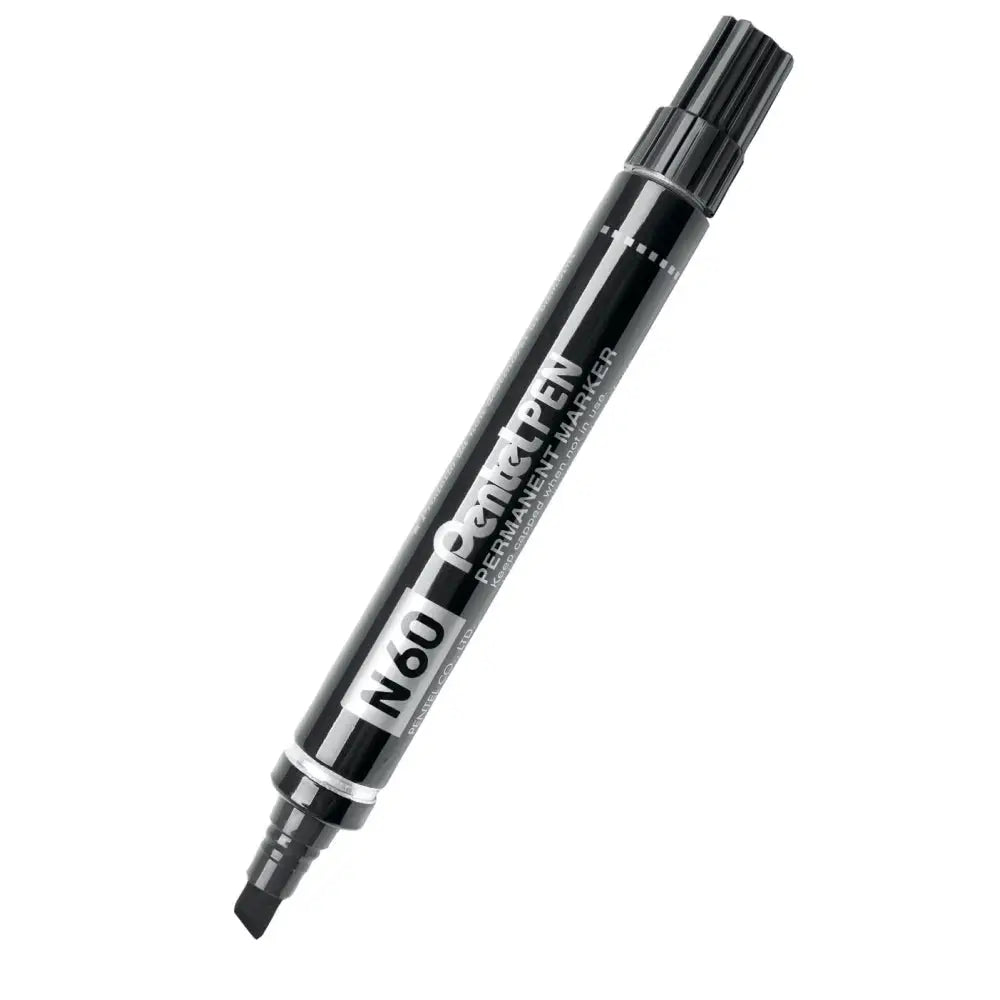 Pentel N60 är en alkoholbaserad vattenfast och snabbtorkande permanent märkpenna med aluminiumkropp och skuren extra tålig fiberspets på 3,9 - 5,7 mm som håller formen även efter långvarig användning.