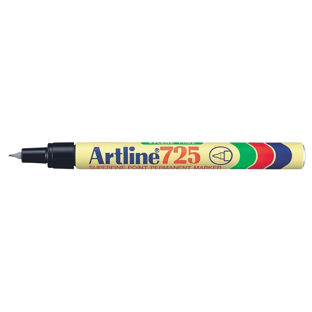 Märkpenna Artline 725. Pennkropp av aluminium och med 0,4 mm spets. Permanent alkoholbaserat bläck. Lämplig på metall, glas, trä, porslin, textil (tvättäkta), folier och film etc. Mycket snabbtorkande och färgbeständig - bleks ej.
