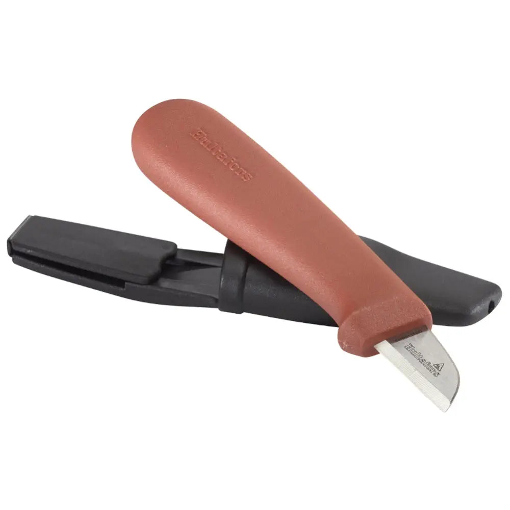 Det tunna bladet, eggens slipning och handtagets utformning är optimerad för skalning av kabel. Unik funktion för att fästa hölstret runt knappen på yrkeskläderna gör att den inte lossnar, samtidigt som den är lätt att ta bort. Knivbladet är tillverkat av japanskt knivstål, 1,5 mm kolstål som härdats till 58-60 HRC.