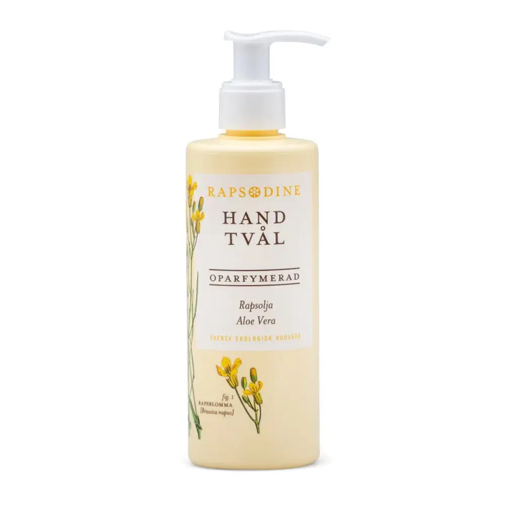 Rapsodine Handtvål Oparfymerad är en dryg och fuktighetsbevarande handtvål, speciellt utvecklad för känslig hud och de som föredrar parfymfria produkter. Den är berikad med svensk ekologisk rapsolja, som verkar återfuktande och mjukgörande, samt aloe vera, känd för sina lugnande egenskaper.