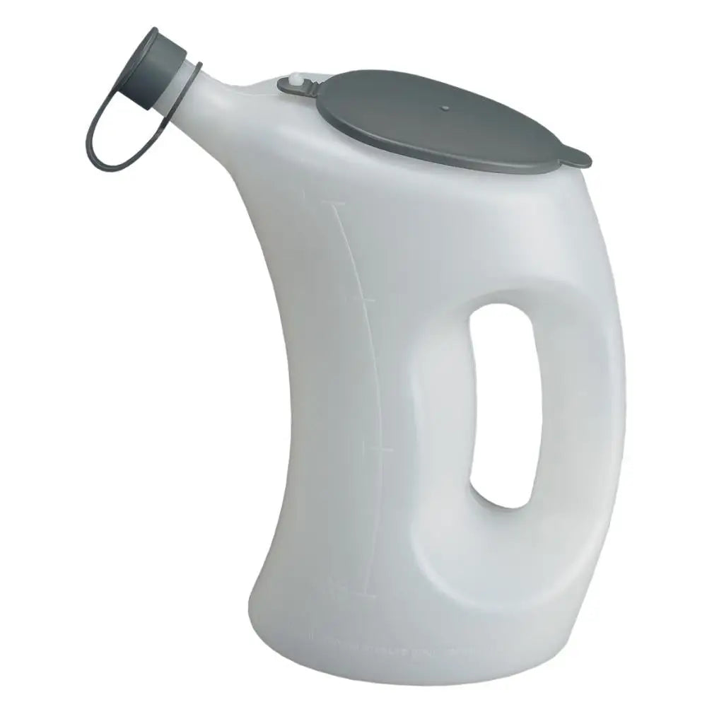 Transparant oljemått i plast med lock för påfyllningshål och pip.