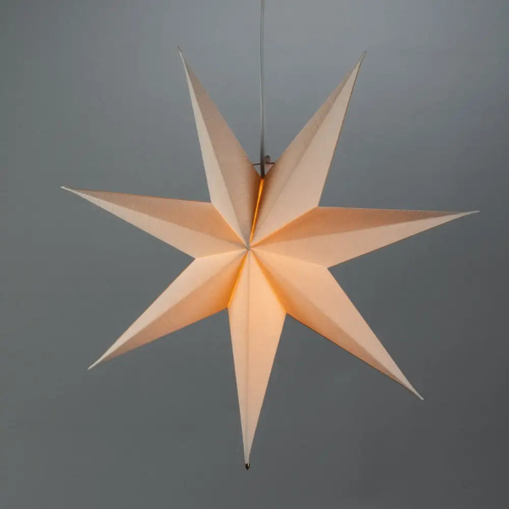 Julstjärna i linneimitation. 230V. Inkl. sladdställ. E14 lamphållare och strömbrytare. Vit kabel. Sladdlängd 500 cm.