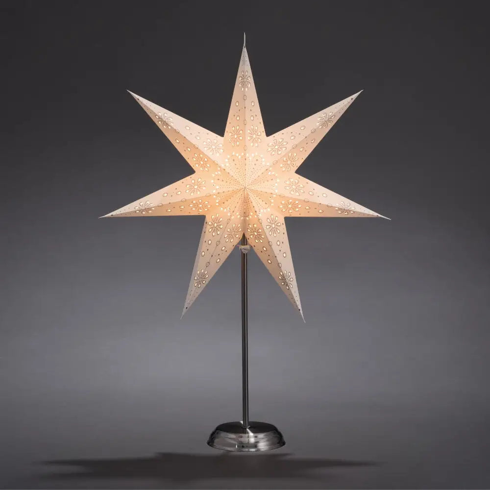 Pappersstjärna, vit med silverfärgat mönster på silverfärgad metallfot. 230V. E14 lamphållare. Sladdlängd 350 cm.